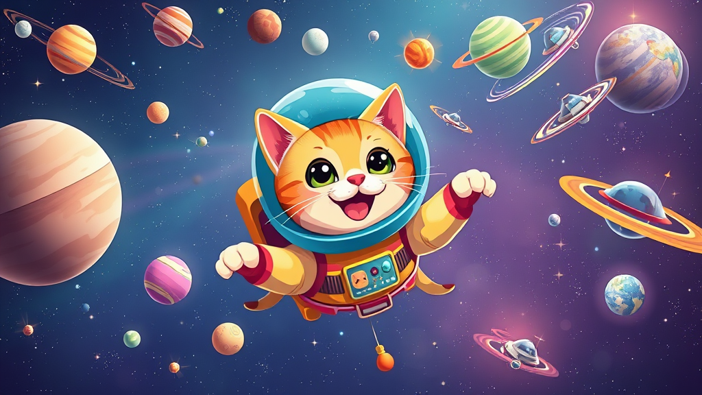 A cheerful and adorable cat beams with a smile as it floats in the vast cosmos, adorned in a vibrant, multicolored space suit. This playful feline drifts amidst a backdrop of exotic, cartoonish planets and twinkling stars, depicted in vivid detail and bursting with bright colors. Adding to the lively scene, sleek spaceships zip by while comets streak across the sky, creating a futuristic and whimsical atmosphere. The cat's round eyes glimmer with curiosity, and tiny asteroids gently float by, enhancing the sense of wonder in this interstellar adventure.