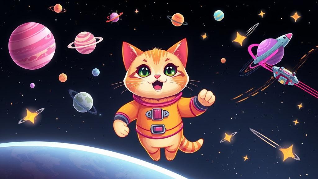 A cheerful and adorable cat floats joyfully in the endless expanse of space, donned in a vibrant, rainbow-colored space suit that gleams against the dark backdrop. The cat's eyes sparkle with excitement, its whiskers slightly waving as if experiencing weightlessness. Around it, the cosmos is alive with a parade of enchanting planets, each distinct in shape and hue; one glows with swirling pink and purple gases, while another has rings shimmering like a kaleidoscope. Bright stars twinkle like jewels scattered across the cartoon-like sky, casting a playful light on the scene. Futuristic spaceships with sleek designs zoom past, leaving trails of neon light in their wake, while comets dash through, their fiery tails streaking across the starry tapestry. It's a wondrous, otherworldly setting that exudes a sense of adventure and whimsy, inviting viewers to dream of far-off galaxies and fantastic journeys.