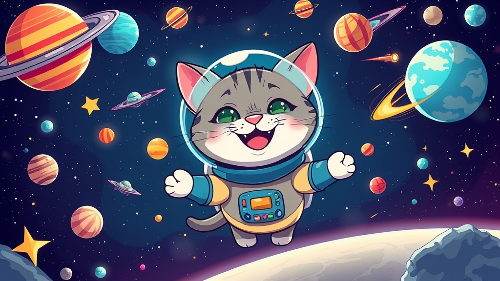 A cheerful and adorable cat grins widely as it floats in the expansiveness of space, adorned in a whimsical and vividly colored space suit. Surrounding the feline are a collection of fantastical planets and luminous stars, all rendered in an imaginative cartoon art style full of vivid details and striking colors. The backdrop is further enlivened by sleek spaceships zipping through the cosmos and bright comets streaking past, creating a lively and futuristic ambiance that enhances the playful scene.