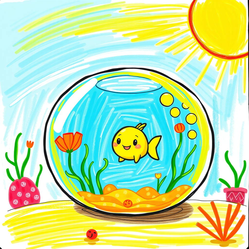 A cheerful cartoon drawing of a rounded aquarium with a charming, cute character inside, set against a backdrop of a bright and sunny day. The scene is infused with lively primary colors, predominantly yellow and green, resembling a playful crayon illustration. The design maintains a sense of beauty with clean, distinct lines while embracing a quirky, imperfect charm, with each element having its own unique flair.