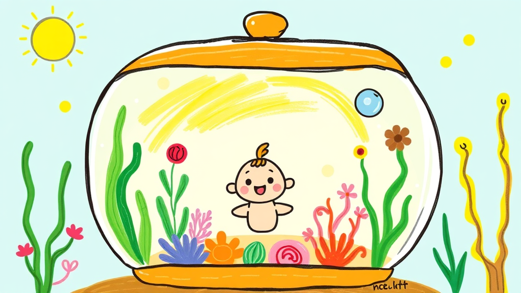 A cheerful, cartoon-style aquarium with rounded edges, featuring an adorable character inside. The scene is set during a bright and sunny day, filled with vivid primary colors like yellow and green. The artwork has a playful, crayon-drawn appearance, giving it a whimsical touch. Each element is unique and diverse, contributing to a lively and joyful atmosphere.