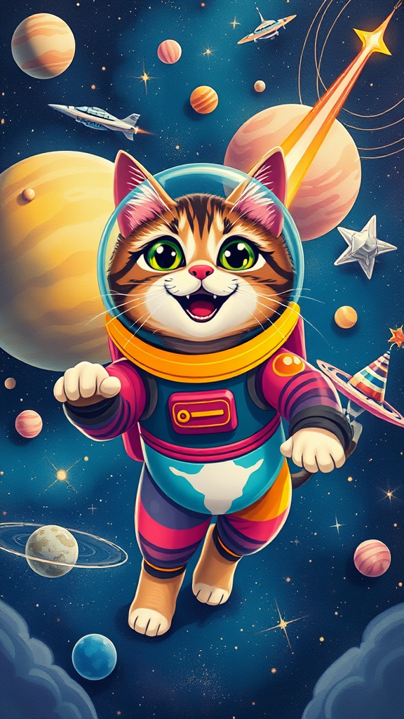 A cheerful cat wearing a vibrant, multicolored spacesuit drifts happily in the vastness of space. Behind the feline, a backdrop of exotic, cartoon-style planets and sparkling stars fills the scene with life and color. The canvas also features sleek, imaginative spaceships zipping around, and bright comets streaking across the sky, adding to the fun and futuristic atmosphere. The catβs large, expressive eyes and joyful smile add a touch of whimsy, making the scene feel playful and full of wonder.