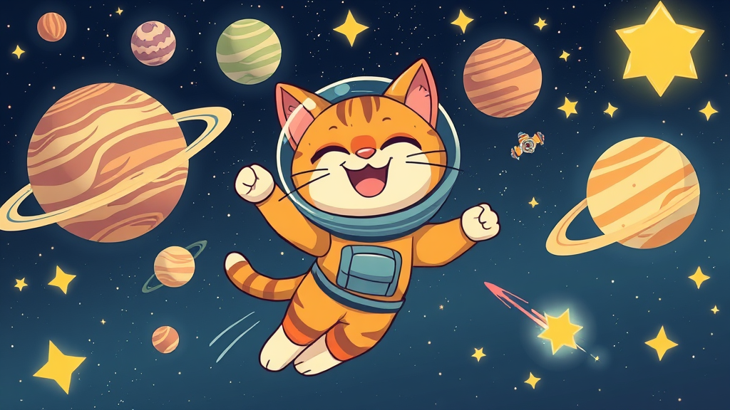 A cheerful cat wearing a whimsical and vibrant space suit is happily floating in the boundless expanse of space. Behind, exotic planets with swirling patterns and bright, twinkling stars light up the scene in a playful cartoon style, rich with vivid colors and intricate details. Small, sleek spaceships zoom by, and comets trail glittering tails, adding to the fun and futuristic ambiance of this imaginative cosmos.
