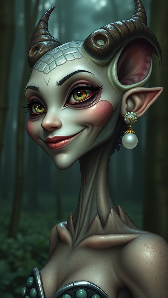 A cheerful cryptid with features of a woman wearing a pearl earring, her eyes bright and curious, with soft scales shimmering on her neck and a hint of fangs peeking from her smile, standing gracefully with an air of meticulous elegance amidst a mystical forest backdrop.