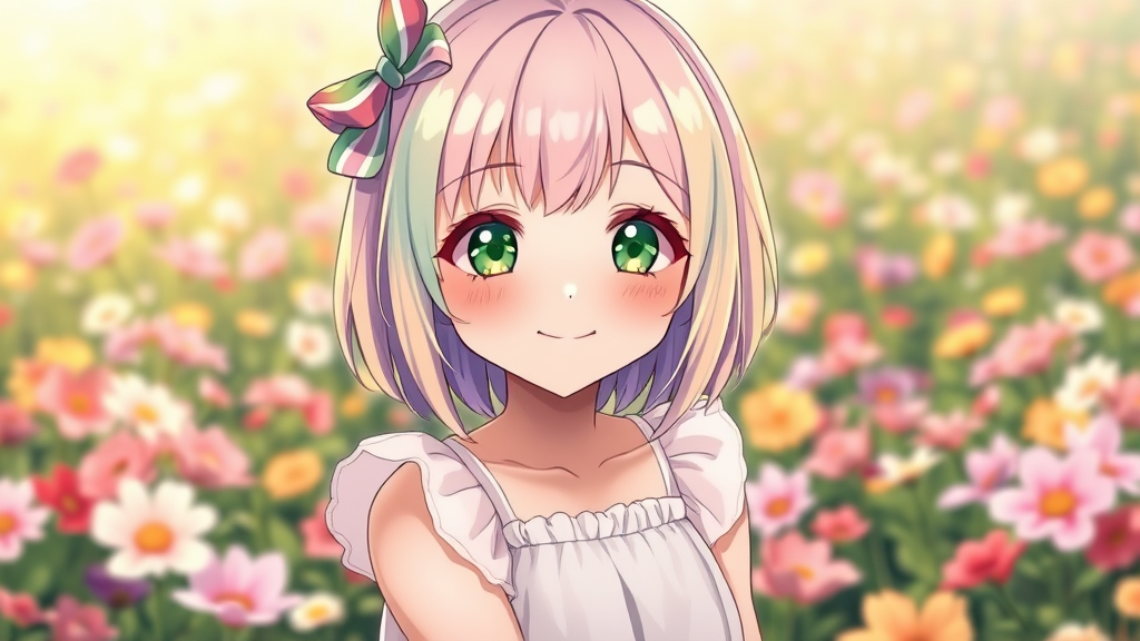 A cheerful girl with pastel rainbow hair and striking olive green eyes, wearing a delicate dress that blends light rainbow hues with soft white. She's joyfully posing in a lush field teeming with vibrant flowers. Her expression exudes happiness, featuring a cute smile that lights up her face. The anime-style scene beautifully captures her essence, emphasizing her captivating gaze and radiant aura, surrounded by the tranquil and colorful ambiance of blooming florals.