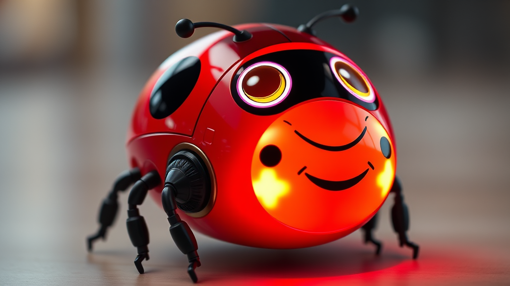 A cheerful ladybird-themed robot designed with a glowing red shell adorned with black spots, featuring large, expressive eyes and a friendly smile that lights up, inviting interaction and spreading joy wherever it goes.