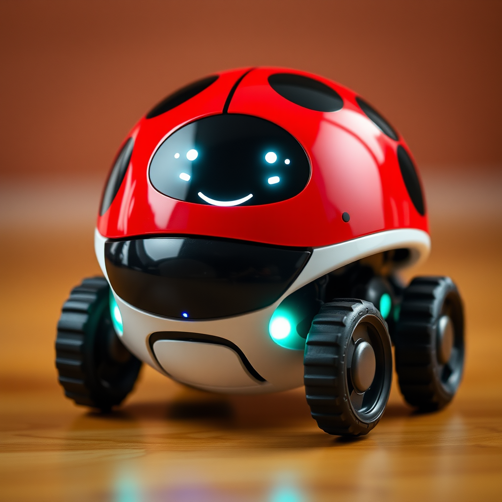 A cheerful ladybug-inspired robot with a vibrant red shell adorned with black spots, equipped with digital eyes that light up when it mimics a friendly smile, spreading joy as it scuttles around with a gentle hum.