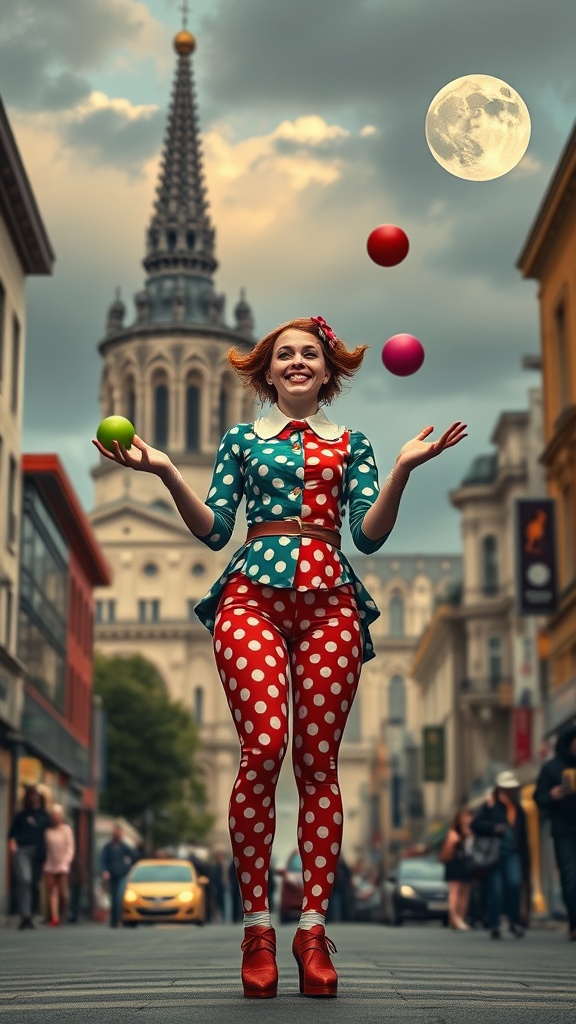 A cheerful woman dressed as a clown stands confidently in the bustling city streets, her kind smile radiating warmth. Her vibrant polka-dot leggings add a playful touch to her pin-up inspired outfit, contrasting beautifully against the ominous sky. She skillfully juggles colorful balls, captivating passersby with her generous spirit. In the background, a majestic cathedral rises, its intricate architecture bathed in the soft glow of volumetric lighting. The full moon peeks through a partially clouded sky, casting an ethereal glow over the scene. The scene is painted with hyper-realistic detail, reminiscent of Frank Frazetta's oil paintings, capturing the spirit of joy amidst the urban landscape.