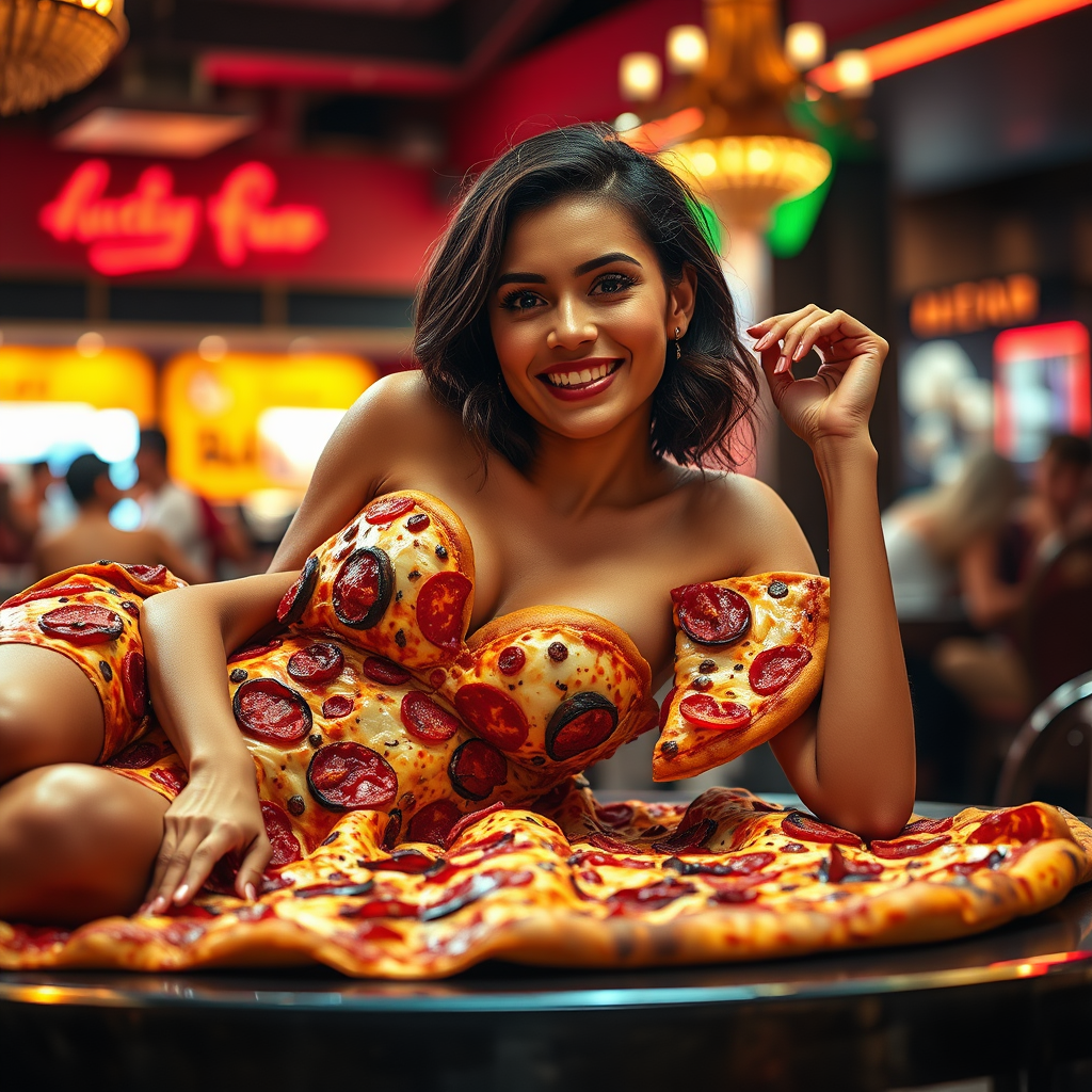 A cheerful woman elegantly reclines on a table, wearing a dazzling gown created from slices of pizza. The scene is a fusion of rich, deep colors and intricate artistry, capturing a masterpiece in vibrant, ultra-high-definition quality. Her eyes are enhanced with a cinematic sharpness, and every detail is captured in 4k resolution, echoing a Blade Runner aesthetic. The focus is precise and the composition flawless, presenting an epic and visually stunning portrait.