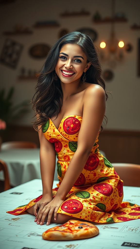 A cheerful woman elegantly wearing a pizza-inspired dress is gracefully posed on a table; she radiates joy. The scene is infused with rich, deep colors and intricate details, presenting a visual masterpiece. The image bursts with vibrancy and is crafted with a cinematic, ultra high-quality focus in mind. Her eyes are enhanced for a captivating gaze, all captured in sharp 4k resolution with an epic touch. The composition avoids any low-quality elements, ensuring a seamless and realistic portrayal, with perfect anatomy and harmonious body positioning. The artwork is free of any inconsistencies or distractions, such as unintended duplications or distortions, resulting in a beautifully composed and vividly detailed piece.