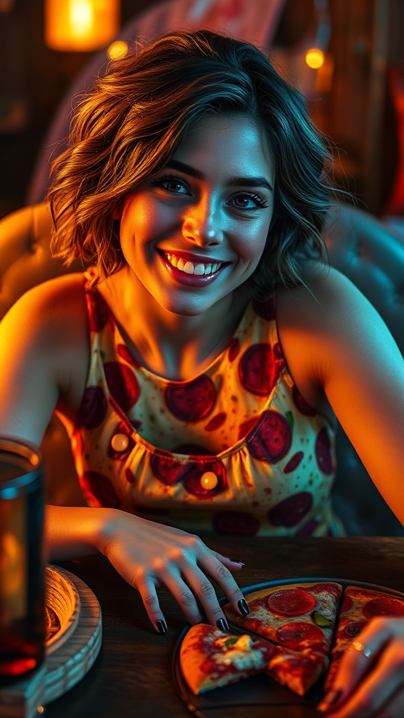 A cheerful woman is adorned in a pizza dress as she reclines on a table, surrounded by rich, deep colors. The artwork is intricate and masterful, with vibrant hues and a cinematic feel. Her eyes are enhanced in detail, creating a sharp focus within the 4k resolution. The composition is epic and precise, maintaining a realistic portrayal with no distortions. The scene is free from any imperfections or flaws, with seamless anatomy and harmonious body positioning. Faces and features are aligned perfectly, creating a stunning and high-quality visual experience.