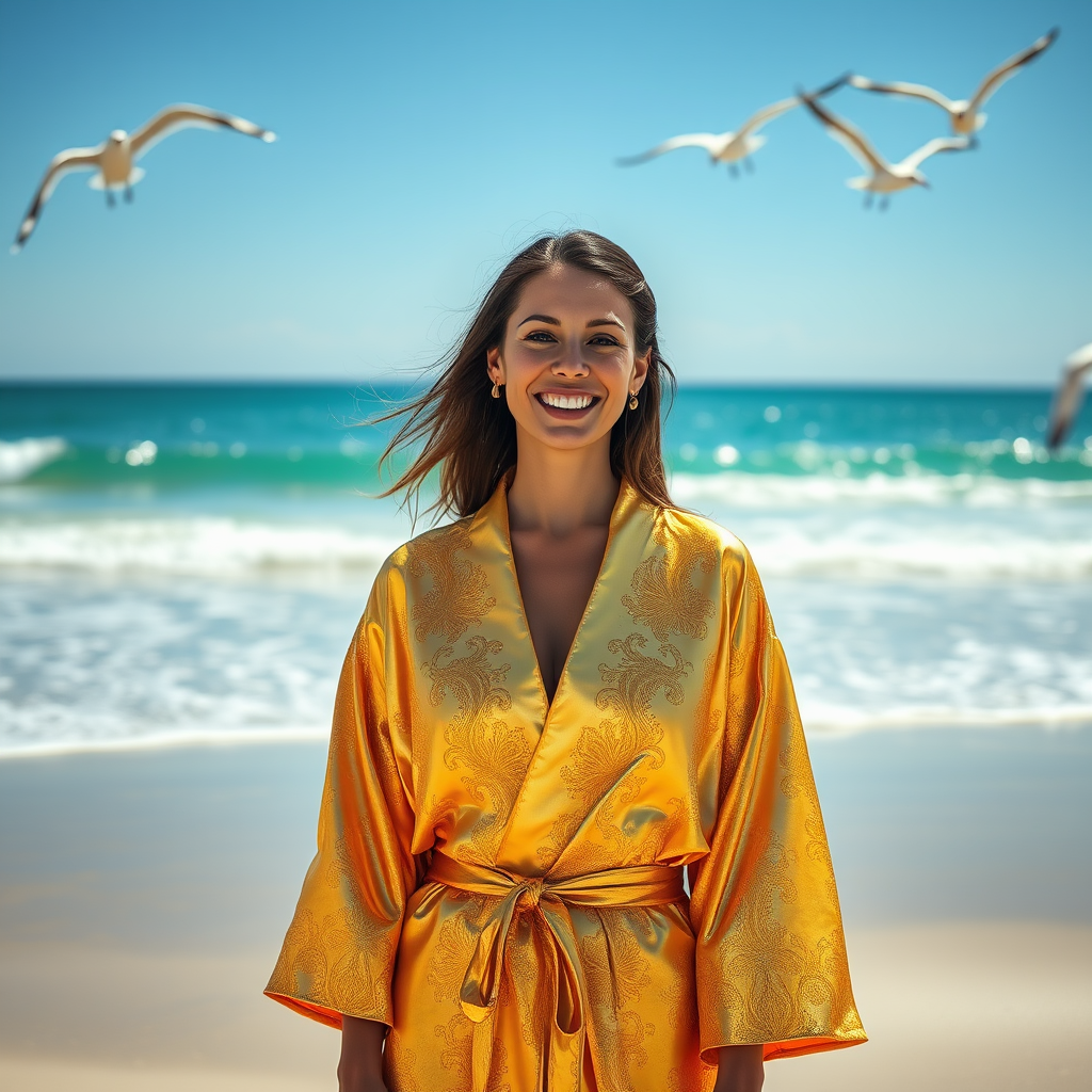 A cheerful woman with a bright smile is dressed in a lustrous, reflective golden kimono, standing under the warm sunlight on the sandy shores of Miami Beach. Her attire glows brilliantly, catching the light in intricate patterns that shimmer with every movement. The ocean waves crest gently in the background, their azure hues contrasting with the golden sheen of her garment. Her eyes sparkle with joy and contentment, mirroring the radiance of her attire. Seagulls glide gracefully in the clear sky, adding to the idyllic beach atmosphere. The overall scene captures a serene and vibrant moment, highlighted by the intricate and realistic details of the setting and her shiny apparel.