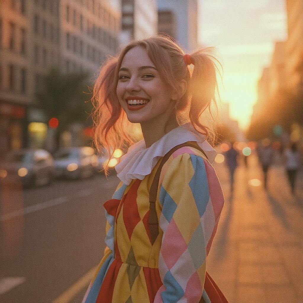 A cheerful woman with pigtail hairstyle, dressed in a playful clown-inspired outfit with harlequin patterns, joyfully strolls through a vibrant city at sunset. Her bright smile reflects genuine happiness as she takes in the urban scenery. The scene is captured in a side view with soft volumetric lighting creating a dreamy atmosphere, reminiscent of a nostalgic polaroid photo, highlighting her delightful presence against the warm hues of the setting sun.