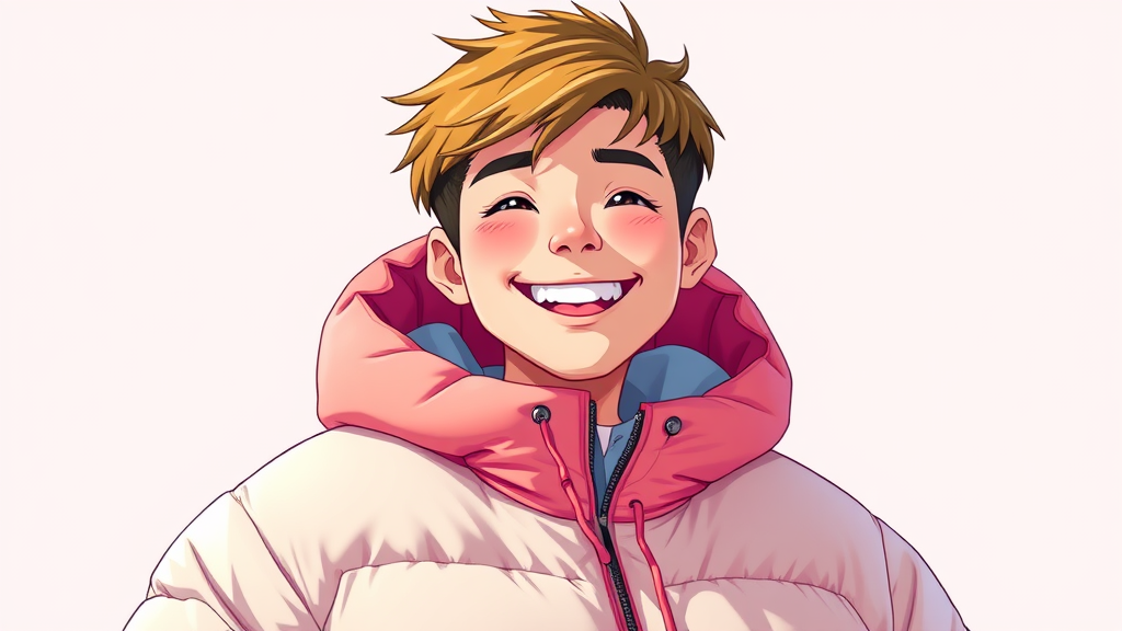 A cheerful young man dons a poncho-style oversized puffer jacket, drawing inspiration from OffWhite and the nostalgic aesthetics of Tumblr. Influenced by the vibrant style of Yanjun Cheng, this digital artwork captures the playful essence of a lo-fi internet meme, gaining traction on design platforms like Dezeen. Rendered in a 3D format reminiscent of Beeple's creativity, with nods to the unique artistry of Rhads and Lois Van Baarle, the illustration merges cartoon influences and retro anime elements. Bathed in bright colors, this captivating piece presents a dynamic and youthful character, offering a modern twist on an iconic aesthetic.