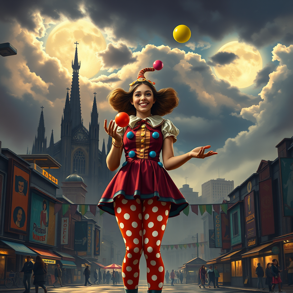 A cheerful young woman dressed as a whimsical clown stands in a bustling cityscape, her kind smile a beacon of warmth amidst the chaos. Her outfit is playful and vibrant, featuring polka-dot leggings that add a touch of fun to the scene. In her hands, she skillfully juggles colorful balls, her graceful movements full of joy and generosity. The silhouette of an ancient cathedral rises majestically in the background, its spires reaching towards the sky. Above, an ominous sky looms, partially obscured by dramatic clouds, while a full moon casts its ethereal glow across the landscape. The interplay of light creates a striking volumetric effect, capturing the surreal beauty of the night. This hyper-realistic scene, painted with the dynamic style of Frank Frazetta, evokes a sense of wonder and magic, as if capturing a moment of serenity in a fantastical world.