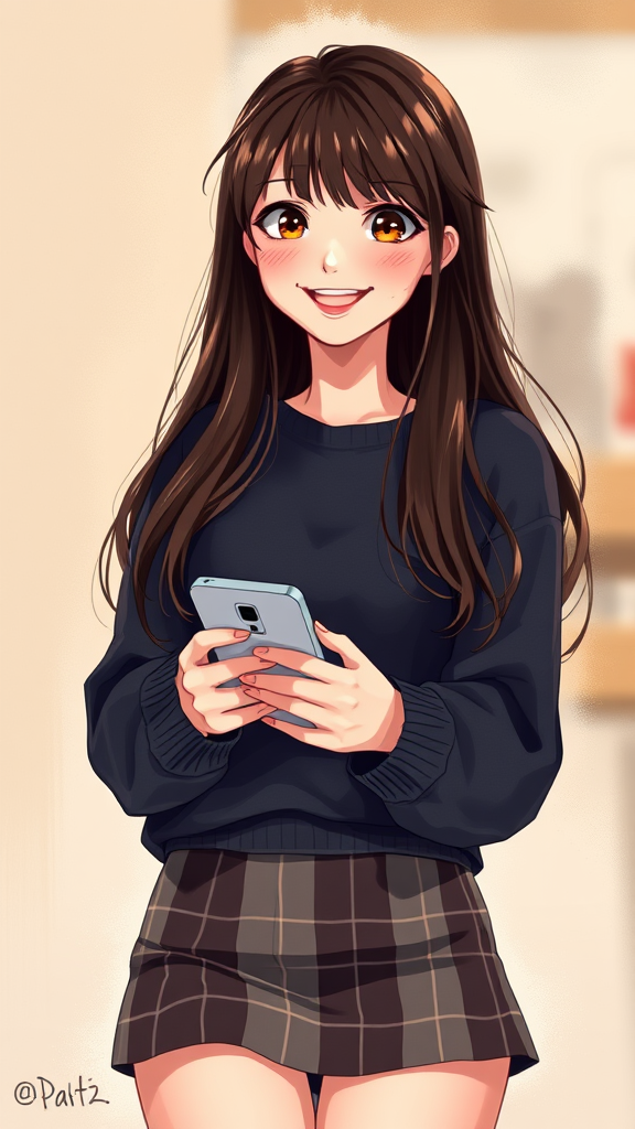 A cheerful young woman with long dark brown hair, adorned in a cozy dark sweater and a stylish plaid mini skirt, is holding a smartphone. She is surrounded by a warm, soft glow that highlights the details of the digital drawing. The scene captures her in a candid moment, her expression a mix of curiosity and contentment, embodying a modern, youthful vibe in an ultra-high-resolution digital painting.