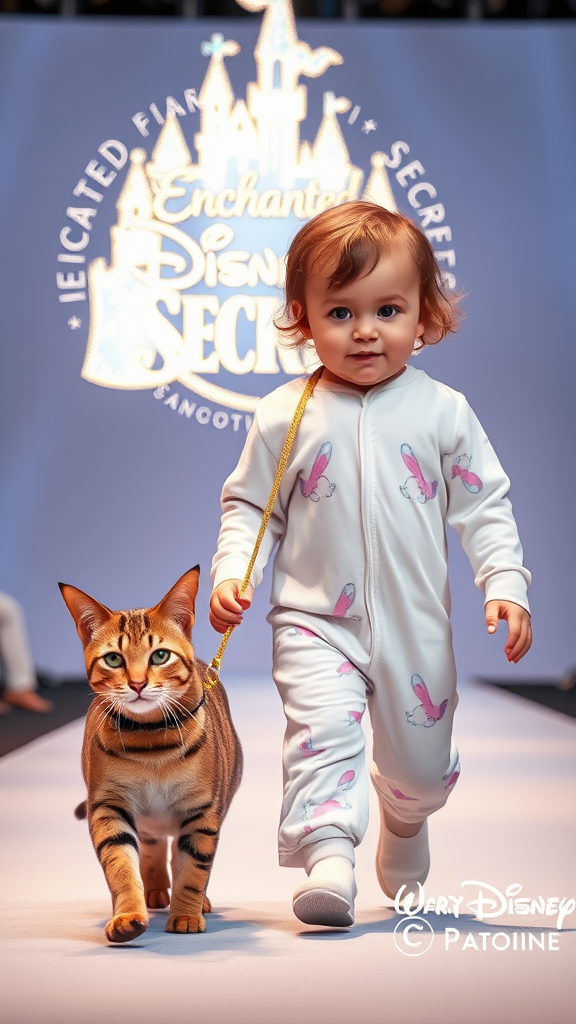 A cherubic toddler clad in pastel bunny pajamas toddles confidently down the runway of a whimsical Disney-inspired fashion show, gently guiding a sleek tabby cat on a shimmering gold leash. The feline, adorned with a jaunty reindeer hat complete with tiny antlers, struts proudly beside its young companion. Behind them, a sparkling emblem in the shape of Cinderella's castle beams the phrase “Enchanted Disney Secrets,” casting a magical glow over the enchanting duo.
