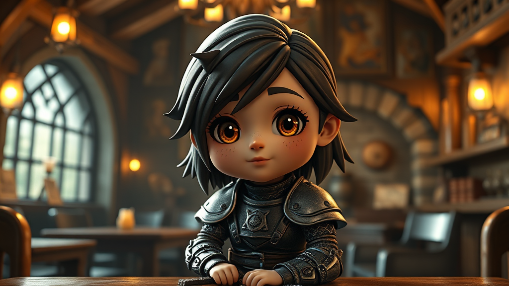 A chibi female cleric in chain mail sits solo in a medieval tavern, surrounded by cozy indoor lighting that gives the scene a warm, inviting atmosphere. Her character design, inspired by Disney artwork, combines the detailed, cinematic style of Mark Ryden, Pixar, and Hayao Miyazaki. Rendered using Unreal Engine 5 and octane render, the composition achieves a hyperrealistic look despite its fantastical elements. The room exhibits intricate details characteristic of fantasy art, as seen on ArtStation, while capturing the essence of a rustic tavern setting. Her face is adorned with freckles, and her expression exudes a sense of wonder and curiosity. Although the tavern's ambiance is enhanced by realistic reflections and shadows, her appearance maintains chibi proportions, with a touch of whimsy. Emphasizing creativity over perfection, minor quirks in her rendering add character without detracting from the overall image.