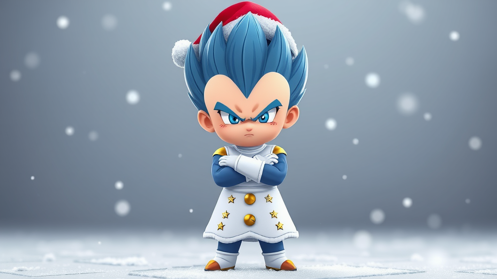 A chibi-style 3D Vegeta, wearing a whimsical Christmas dress adorned with twinkling stars and small bells, standing proudly with crossed arms, his trademark scowl softened slightly. Snowflakes gently fall around him, and a Santa hat perched atop his spiky hair adds a touch of festive humor.