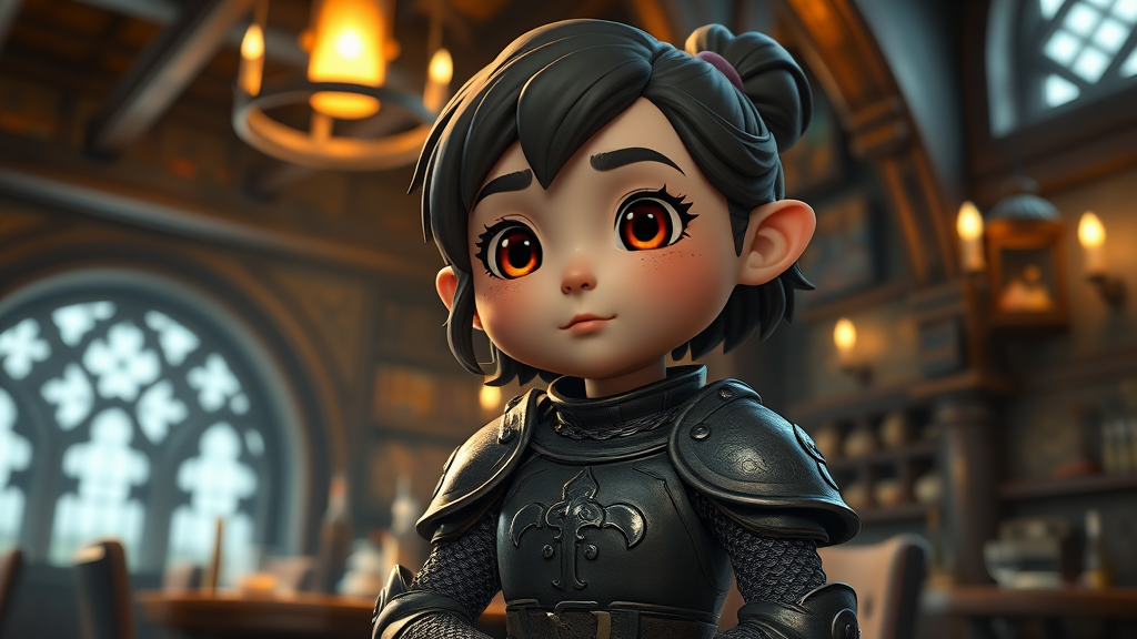 A chibi-style cleric woman in chain mail stands solo in a medieval tavern. Inspired by the whimsical charm of Disney, Pixar, and the intricate detail of Hayao Miyazaki's works, this character is brought to life with hyperrealistic rendering from Unreal Engine 5 and Octane Render. She is seated under cozy indoor lighting that highlights her fantasy-inspired attire. Her face is adorned with freckles, adding to her unique appeal, though her features are characterized by an intentionally exaggerated and quirky style. Her expression is lively yet comical, fitting the playful art style. Despite the low-resolution and intentionally flawed anatomy, there's a charm in the whimsical errors that create extra limbs and mismatched features, while her vibrant personality shines through the medieval setting, evoking a sense of cinematic fantasy. The scene is a digital painting with elements reminiscent of the detailed designs seen on platforms like ArtStation, inviting a whimsical and imperfect exploration of character artistry.