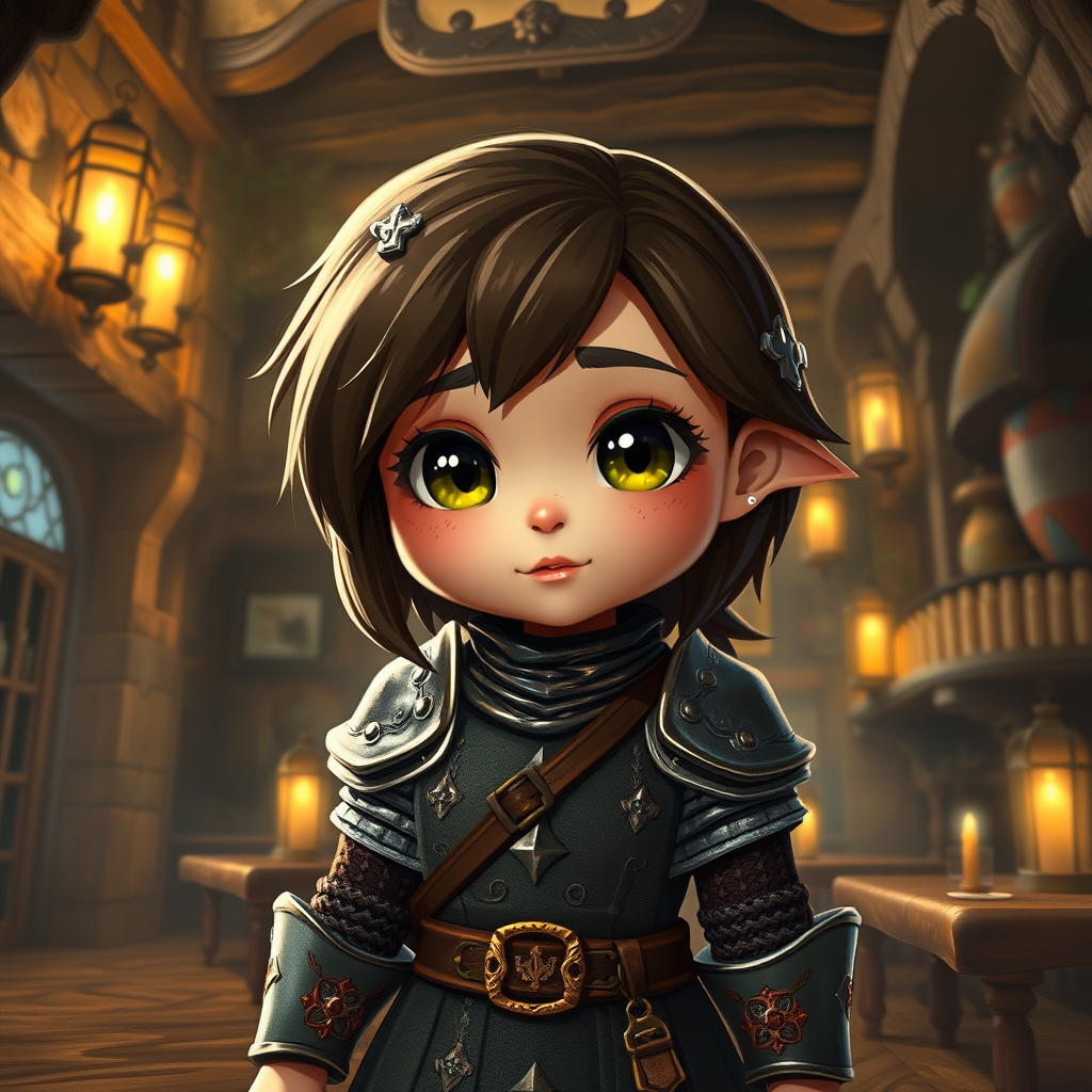 A chibi-style female cleric adorned in chainmail stands solo in a medieval tavern, exuding a charming Disney-like essence. The scene is illuminated with cozy indoor lighting, showcasing a blend of fantasy and realism reminiscent of art styles by Mark Ryden, Pixar, and Hayao Miyazaki. The digital painting captures a cinematic feel with intricate details, rendered hyperrealistically using tools like Unreal Engine and Octane Render. Freckles grace her cheeks, enhancing her youthful appearance amidst an enchanting backdrop evocative of medieval times.