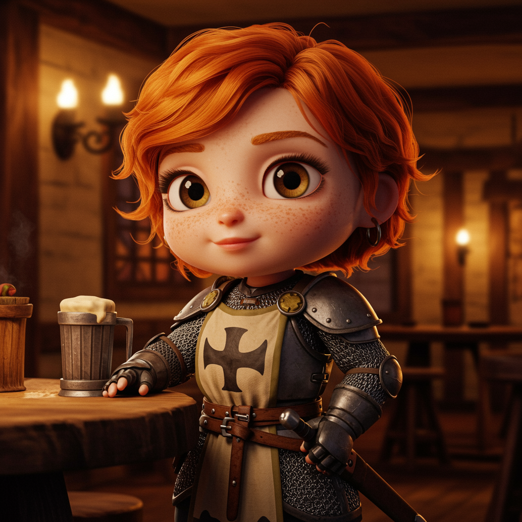 A chibi-style woman cleric wearing chain mail, depicted in a cozy medieval tavern setting. The artwork embodies a blend of Disney, Pixar, and Hayao Miyazaki influences, resulting in a whimsical and detailed digital painting created using Unreal Engine 5 and Octane Render. The scene is bathed in warm, indoor lighting, capturing the fantasy essence with hyperrealistic textures. The character showcases a freckled face, exuding charm and personality. Despite the intricate design, there are deliberate imperfections, such as low-quality elements and anatomically quirky features, enhancing the artwork’s unique, imperfect appeal. This creative portrayal emphasizes a blend of vibrant fantasy storytelling and the cozy ambiance of a tavern, akin to cinematic character designs by artists like Mark Ryden.