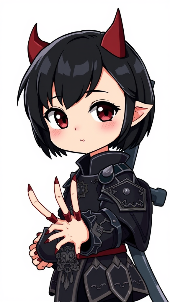 A chibi-style young girl with black hair in a bob cut, dressed in ornate black armor, carries a sword behind her back. She has cute devil horns, and her facial features are slightly exaggerated with a hint of a mischievous expression. The image quality is 8K, presenting an ultra-high-definition and high dynamic range. Her hands have unique, artistic features with extra fingers, showcasing a playful take on mutation. Her design is charmingly whimsical, maintaining a cartoon-like essence. The scene is vibrant and clear, with a focus on the character's distinctive and imaginative appearance.