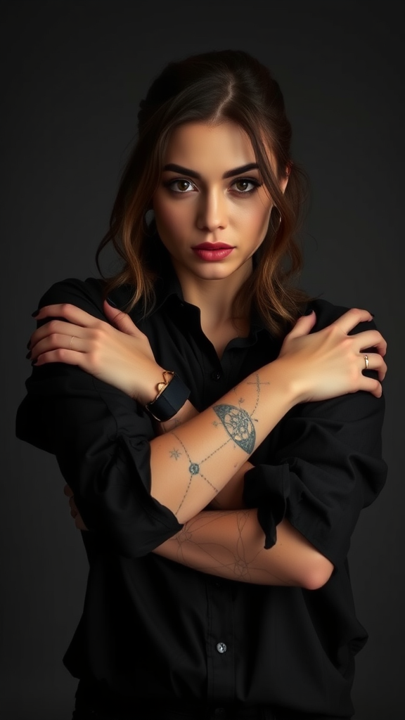 A chic woman in a black shirt stands with her arms confidently folded. Her style is effortlessly normcore, blending dark silver and dark gold tones that shimmer subtly. The focus is on the intricate connections at her joints, reminiscent of tattoo artistry. She exudes a happycore vibe, her presence both striking and serene. Her look is polished yet understated, capturing the essence of palewave with muted colors that complement her overall aesthetic.