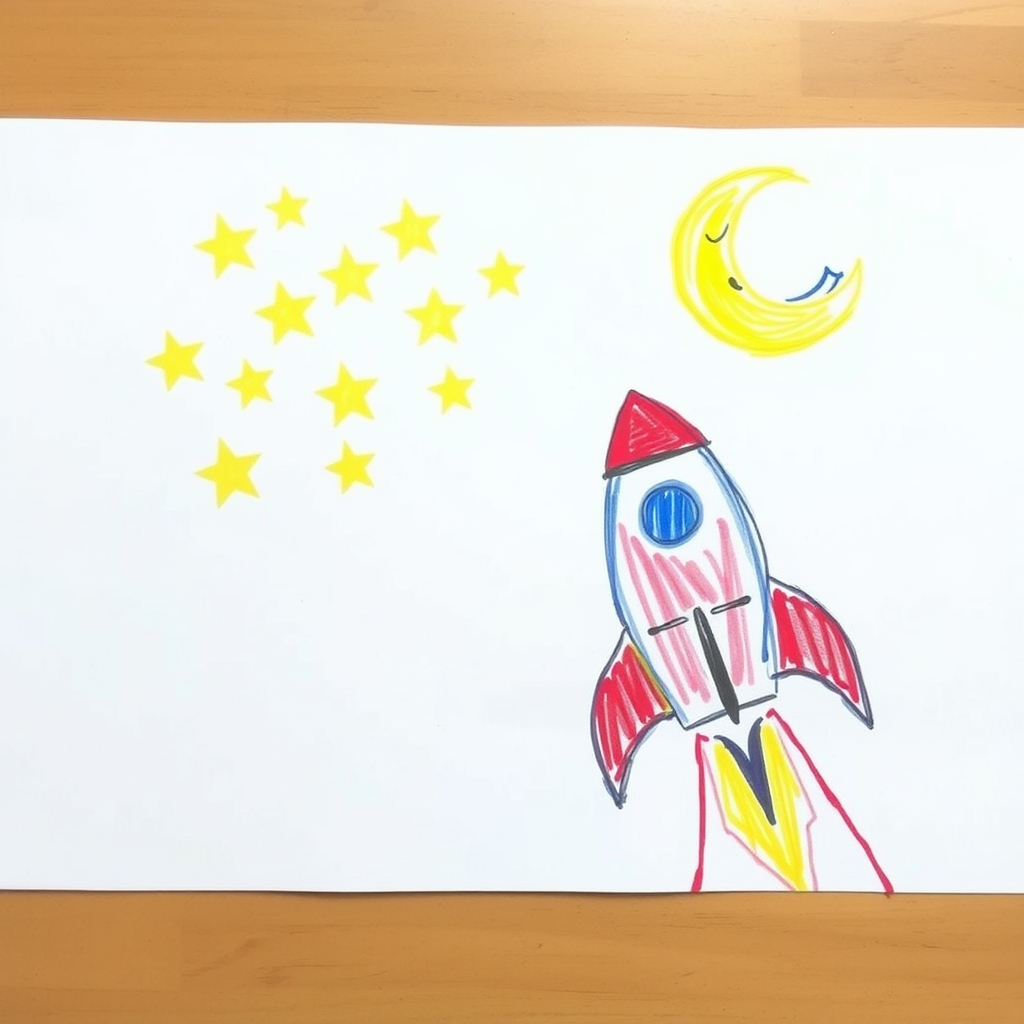 A child's colorful crayon artwork on a blank canvas, featuring an endearing rocket ship soaring toward a cluster of twinkling stars and a smiling crescent moon, with charmingly imperfect lines and splashes of imagination.