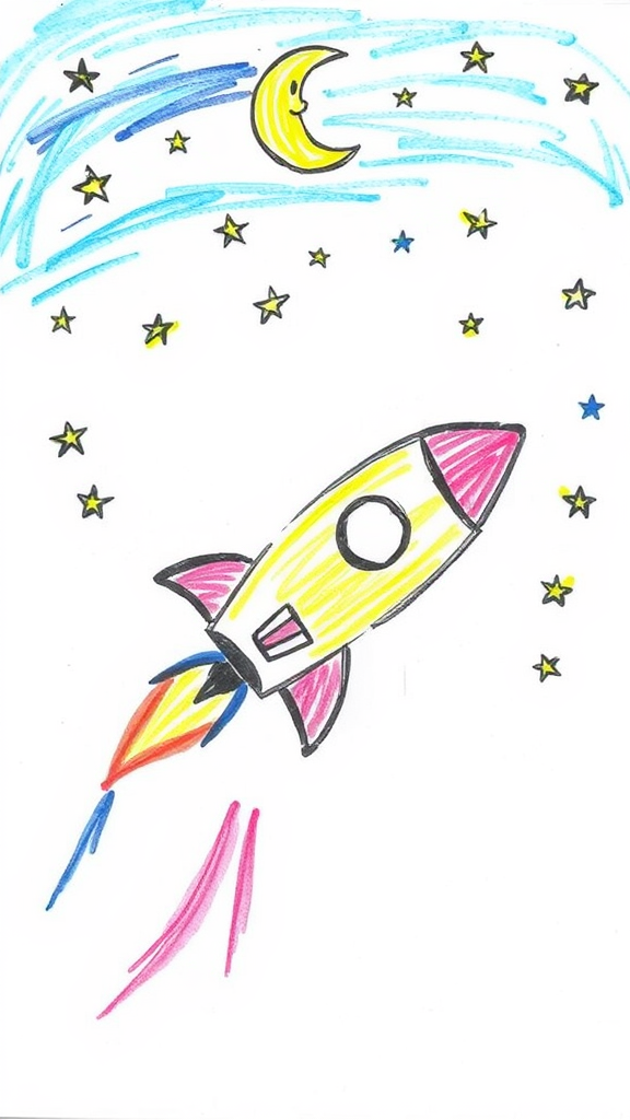 A child's colorful crayon creation on a blank sheet of paper featuring a whimsical rocket ship soaring through a sky sprinkled with twinkling stars and a smiling crescent moon, charmingly naive and vibrantly imperfect, as if imagined by the delightful imagination only a child can conjure.