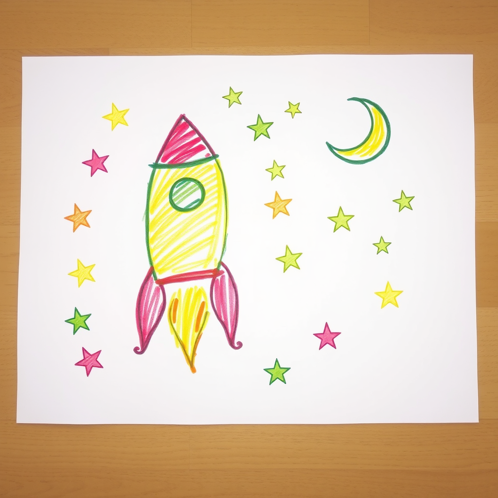 A child's colorful crayon drawing on a sheet of white paper features an endearing, slightly wobbly rocket ship surrounded by twinkling stars and a smiling crescent moon in the distance, each element lovingly crafted in the vibrant style typical of Crayola artistry.