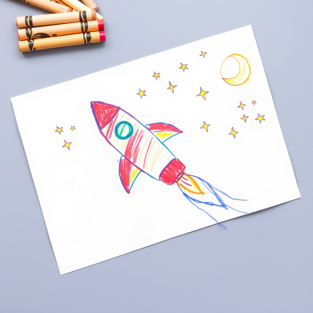 A child's vibrant crayon drawing on a white sheet of paper depicts a whimsical rocket ship zooming through space, with twinkling stars and a crescent moon in the distance; the outlines are endearingly wobbly and the colors slightly outside the lines, capturing the innocence and imagination of a young artist with a box of Crayolas.