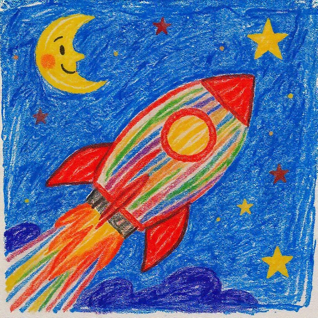 A child's whimsical crayon drawing depicts a colorful rocket ship, its lines adorably uneven, soaring through a star-studded sky with a friendly half-moon smiling in the distance, the vibrant colors of Crayola bringing a magical touch to the cosmic adventure.