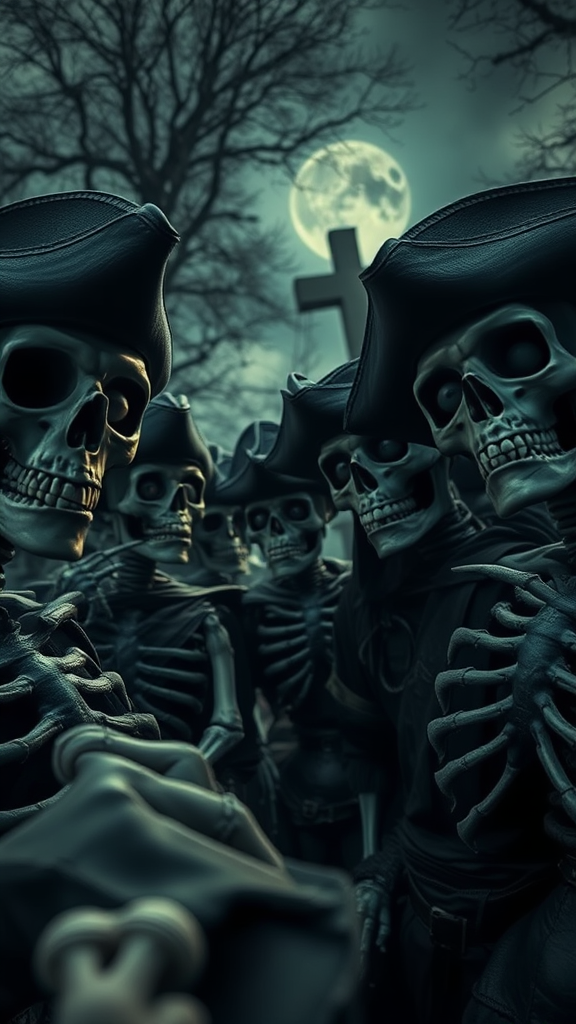 A chilling and atmospheric scene in a graveyard featuring a group of skeletons and pirates taking a selfie. The mood is dark and dramatic with a cinematic flair, capturing vivid, intense details that evoke a sense of unease. The image is presented in ultra-high definition with striking HDR effects, emphasizing the eerie and ghostly ambiance. Some characters exhibit slightly deformed or mismatched eyes, with their irises and pupils appearing warped, adding to the unsettling mood. The characters may have unique features like cross-eyed expressions or anomalies such as extra fingers and unusual hand formations, contributing to the overall surreal quality. The composition is tightly focused, creating a claustrophobic feel while maintaining the spooky aesthetic, and avoiding any distracting elements like text, watermarks, or signatures. The scene is carefully cropped to keep the viewer immersed, without any extraneous details or out-of-frame distractions.