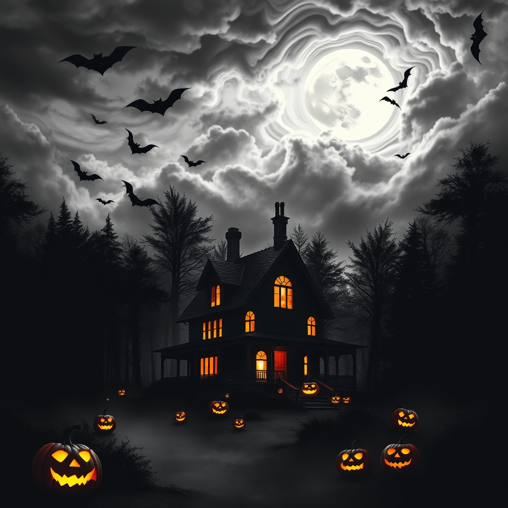 A chilling black and white image of a spooky haunted house nestled deep in a shadowy forest, where eerie silhouettes of bats flutter against a stormy sky. The haunting scene is punctuated by the vibrant glow of sinister jack-o-lanterns casting flickering orange light across the misty ground. Overhead, a full moon peeks through swirling, tumultuous clouds, casting an otherworldly glow across the landscape.