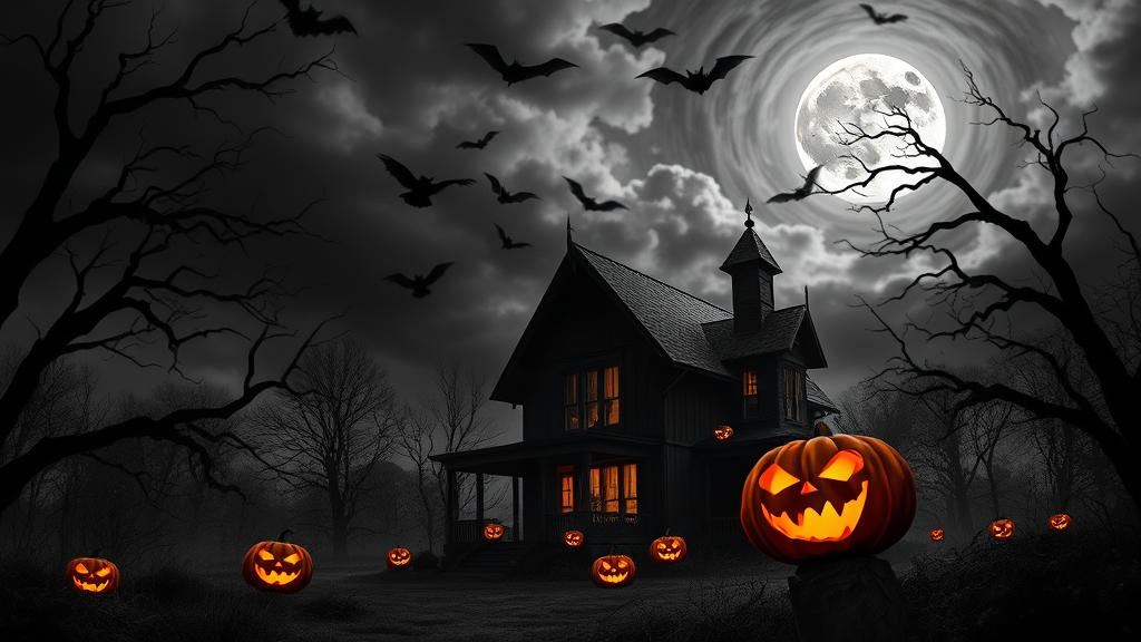 A chilling black and white scene of a haunted house standing eerily amidst a shadowy forest, the air thick with anticipation as bats flutter against a looming, stormy night sky. Vibrant, glowing jack-o-lanterns cast an otherworldly orange light, their sinister grins adding a pop of color and mystery to the monochrome landscape. The full moon peeks through the swirling storm clouds, illuminating twisted branches that whisper secrets of the past, enhancing the spine-tingling atmosphere of this spectral setting.