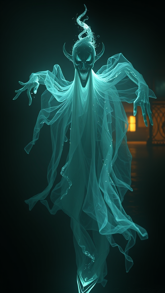 A chilling, breathtaking apparition of a Ghostly Jinn or Ifrit, evoking fear and wonder, wrapped in the eerie ambiance of a haunted night. Created with Unreal Engine 5, the scene exudes cinematographic artistry, showcasing a rich color grading akin to editorial photography. The 70 mm lens captures every nuance with a deep depth of field and tilt-shift blur, while a 1/1000 shutter speed and F/22 aperture ensure clarity. White Balance and 32k Super-Resolution enhance the Megapixel quality in ProPhoto RGB. The VR experience is elevated with high, epic visuals reminiscent of Artgerm and Alex Ross, employing Halfrear and Backlight, naturally incandescent and moody. Cinematic, studio, and soft lighting combines voluminous Contre-Jour, with dark, accentuating global and screen space global illumination. Ray Tracing enhances global illumination and reflections, with a red rim and cool color grading at 45%. Optical elements scatter and glow amidst deep shadows, creating a rough, shimmering effect. Lumen and screen space reflections join diffraction grading, chromatic aberration, governing GB displacement, and scan lines. Ray Tracing, ambient occlusion, Anti-aliasing (FKAA, TXAA, RTX, SSAO), shaded by OpenGL and GLSL, blend post-processing and production. Cel shading and tone mapping in CGI, complemented by intricate VFX and SFX, craft an insanely detailed and hyper-maximalist yet elegantly hyper-realistic scene. The composition captivates with super-detailed, dynamic central poses, captured in striking 16:9 photography with a --s 750 intensity.