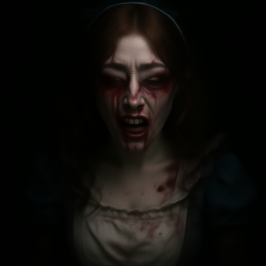 A chilling depiction of a woman embodying an ominous version of Alice in Wonderland, this 30-year-old character exudes a fearsome aura. She's adorned in an eerie costume resembling Alice, her expression a mix of anger and fright, her gaze piercing the viewer. Blood stains add a sinister touch to her appearance. This photographic masterpiece captures the essence of hyperrealism with detailed skin textures and vibrant RAW colors, all enhanced by diffused soft lighting. The composition features a shallow depth of field with razor-sharp focus, utilizing professional cinematic CGI lighting to elevate its realism. Despite the perfection in detail, elements of low resolution and digital artifacts subtly disrupt the image, introducing a layer of unsettling imperfection. The portrayal avoids grotesque misrepresentations or fantastical anatomy, remaining grounded in human realism while employing creative liberties in its unsettling theme.