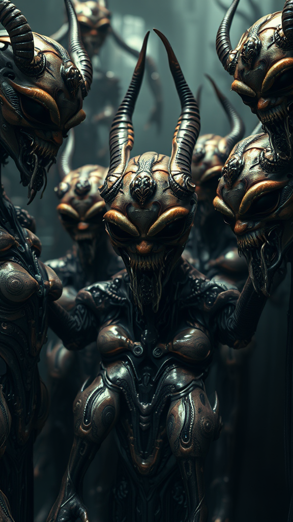 A chilling ensemble of eerie, slimy female cyborg demons, each posed uniquely amidst a darkly cinematic, highly detailed background reminiscent of Giger's surreal biomechanical landscapes. The scene, inspired by Lovecraftian horror, Ansell’s intricate compositions, and Gerard’s fantastical whimsy, showcases stunning macro photography detail in the style of Miki Asai. Close-up, hyper-realistic features accentuate the glossy, otherworldly textures of the cyborg forms. The sharp focus reveals their intricate mechanical and organic elements, presenting a studio photo-quality rendering. This concept, trending on Artstation, is executed with the artistic finesse of Greg Rutkowski, weaving together an unsettling tapestry of creativity and terror.