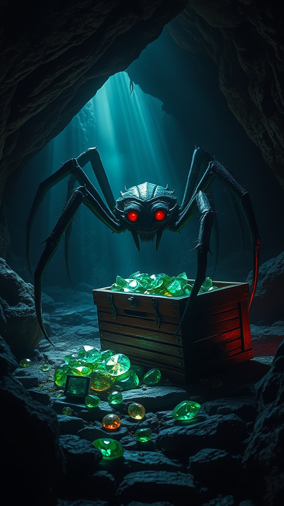 A chilling entity resembling a spider with elongated limbs and glistening carapace, its many eyes glowing an eerie crimson. It lurks within the shadows of a dimly lit cave, the air thick with tension. Amidst the foreboding atmosphere, an ancient wooden chest filled with shimmering emeralds spills its treasure across the rocky floor, casting flickering reflections on the cavern walls. The scene exudes horror and mystery, captured with intricate details that lend a cinematic quality to the fantasy-inspired tableau, rendered in breathtaking 4K resolution.