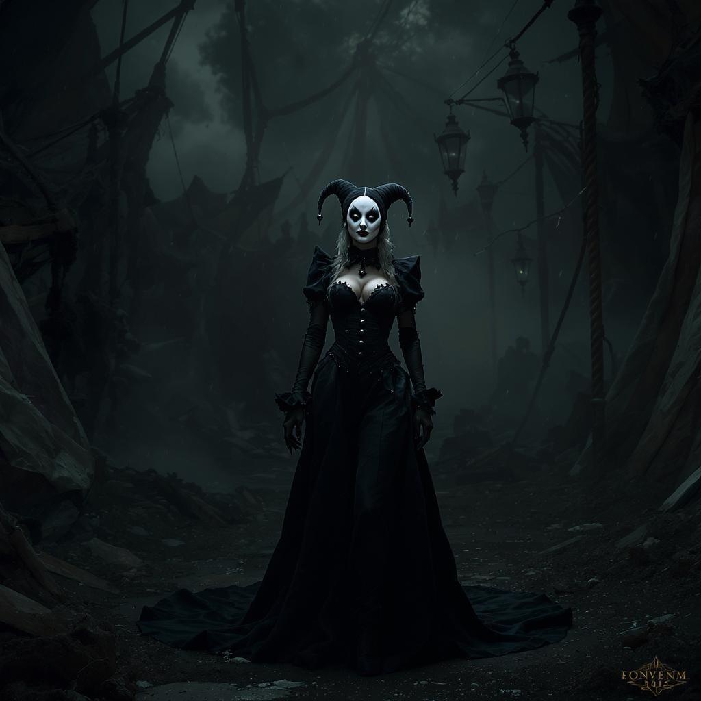 A chilling female harlequin draped in gothic black harlequin attire stands amidst a shadowy, grotesque circus setting. The eerie atmosphere of the dark circus show is imbued with a sense of macabre horror, featuring intricate designs and elaborate details. Dramatic lighting accentuates her mysterious allure, while a photorealistic, cinematic quality brings the scene to life with subtle cinematic noise, captured in stunning 8k resolution. The elongated aspect of her sinister elegance is striking against the haunting backdrop.