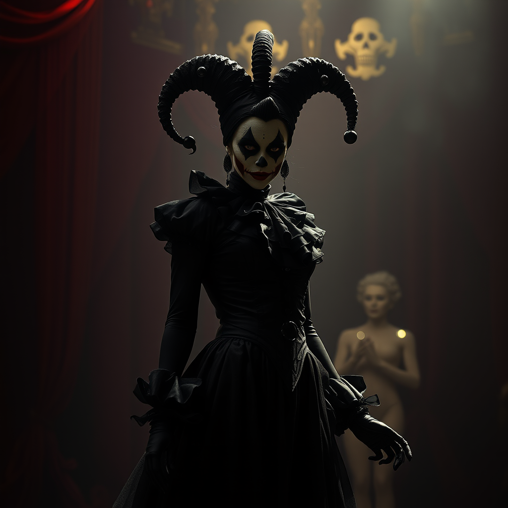 A chilling harlequin woman clad in gothic black harlequin attire standing at the heart of a sinister circus performance; the atmosphere is dark and grotesque; macabre elements ensnare the senses; her attire intricately detailed, exuding an air of horror. The scene is illuminated by dramatic lighting, casting ominous shadows that dance around her. Photorealistic in detail, with a cinematic quality that captures every nuance; the image teems with haunting textures and features, an unsettling ambiance underscored by cinematic grain, rendered in stunning 8k clarity, evoking a sense of dread.