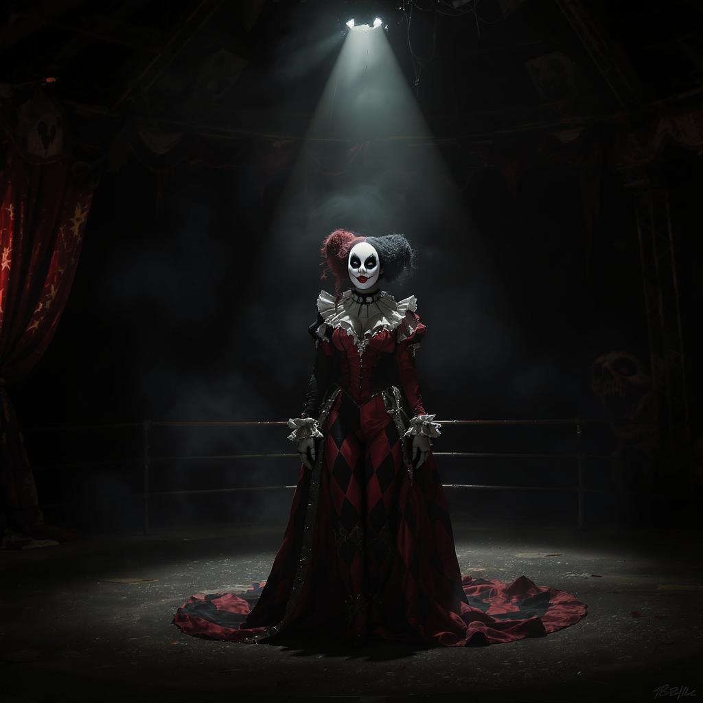 A chilling harlequin woman dressed in gothic black harlequin attire commands the eerie spotlight of a shadowy, grotesque circus performance. The scene is filled with an air of macabre, combining horror with intricate design elements and meticulous details. Dramatic, moody lighting enhances the photorealistic tableau, creating a cinematic aura complete with subtle noise effects, captured in stunning 8k resolution. Set in a narrow, ominous vertical frame, this sinister spectacle merges the bizarre allure of the dark circus with the haunting presence of its enigmatic star.