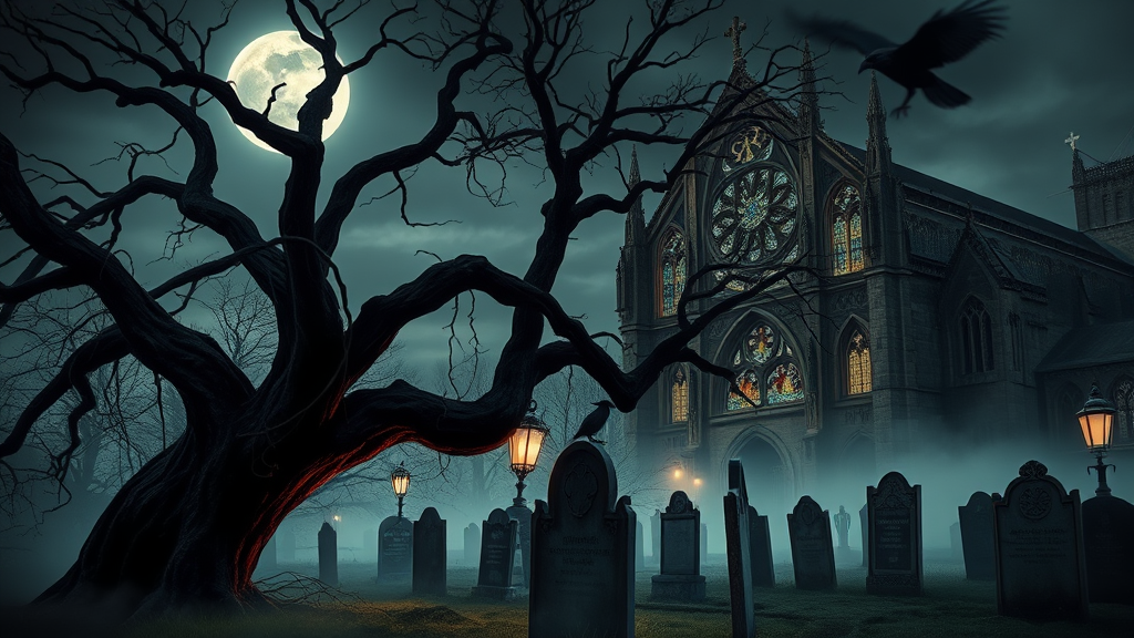 A chilling, moonlit night scene featuring an ancient, gnarled tree with twisted branches reaching out like skeletal hands. Shadows stretch across a fog-laden graveyard, where dilapidated tombstones and flickering lanterns cast eerie, flickering light. In the background, a crumbling Gothic cathedral looms, its stained glass windows glowing ominously. A solitary raven perches atop a tombstone, its eyes gleaming with an otherworldly intelligence. wisps of mist weave through the scene, adding an air of mystery and suspense.