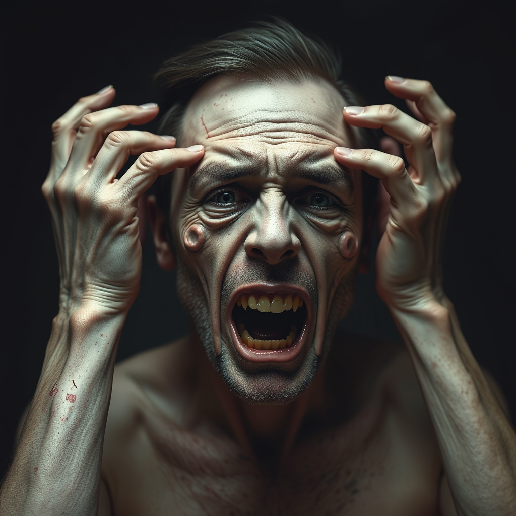 A chilling portrait of a brutal and broken man, isolated in his own despair. The composition conveys an unsettling and heart-wrenching solitude, rendered in dark, gloomy tones that evoke horror and emotional depth. The image leaves an indelible and haunting impression on the psyche, with intricate details that maintain its unforgettable impact. It features a grotesque array of characteristics: low quality, jpeg artifacts, duplication, and morbid mutilation. The anatomy is distorted, with poorly drawn hands and faces, mutations, and blurry, misshapen features. Limbs are malformed or missing, sometimes replaced by extra, deformed appendages. The proportions are bizarre and unsettling, with elongated necks and disfigured, cloned faces. The overall appearance is distorted further by bad anatomy, misshaped bodies, and disfigured teeth. The image is marred by cut-off elements, adding to the sense of a fractured, nightmarish reality.