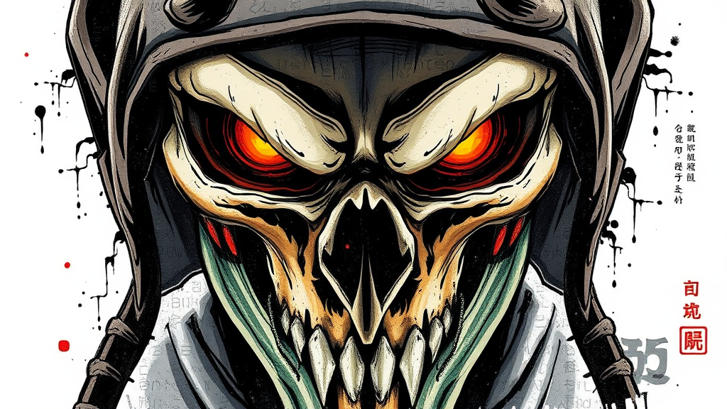 A chilling portrait of a character inspired by Scorpion from Mortal Kombat, featuring an eerie skull visage and warm, dull, lifeless eyes that evoke true terror. This close-up scene is captured through an ink artistic conception, embellished with typography elements and abstract designs. Utilizing complementary colors, the depiction is rendered as a mosaic of characters that create a visually striking wallpaper style. The essence of simplicity is embraced, drawing influence from traditional Chinese painting, all set against a stark white background to enhance the haunting aura.
