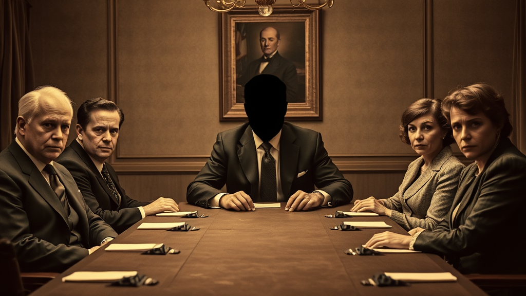 A chilling sepia-toned photograph captures a gathering of elegantly dressed men and women seated around an elongated table. While it resembles a standard formal meeting, one man at the center has his face eerily obscured by a dark shadow, as if the image refuses to reveal his features. The others cast anxious, sideways glances toward him, their expressions subtly tense and concerned.