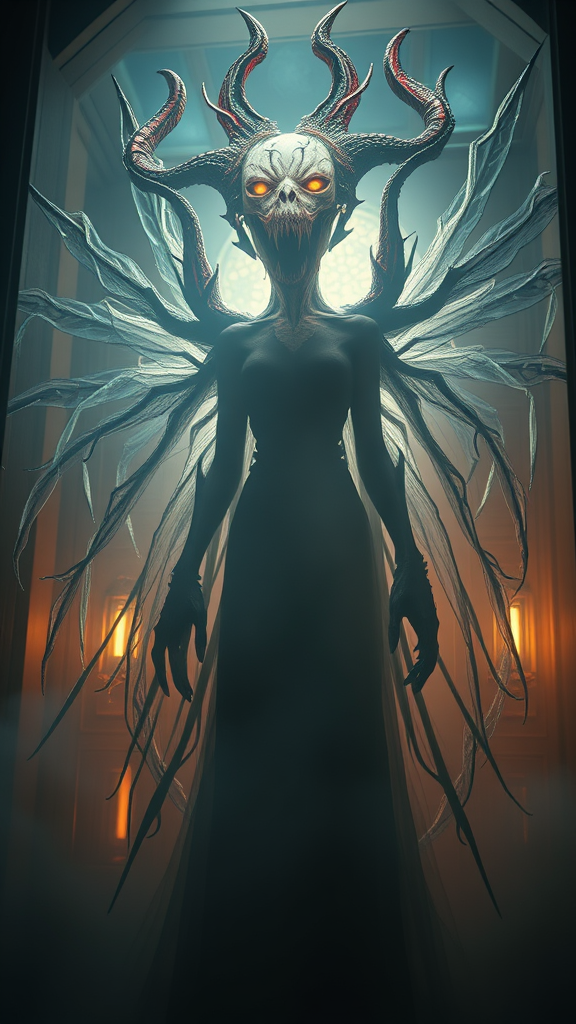 A chilling vision of a terrifying and awe-inspiring Ghost Jinnat emerges from the shadows, a synthesis of ghostly apparitions and demonic entities like Jinn, Ifrit, and Demons. Captured with the cutting-edge technology of Unreal Engine 5, this scene immerses viewers in horror, blending haunted atmospheres with nightmarish elements. The cinematographic essence is elevated by editorial-style photography, featuring a meticulously staged photoshoot with an ethereal depth of field. Shot through a 70mm lens at a 1/1000 shutter speed with an aperture of F/22, the dynamic balance of warm incandescent and natural lighting creates an eerie ambiance. Rendered in ultra-high 32k Super-Resolution, using a ProPhoto RGB color space, the image draws from inspirations like Artgerm and Alex Ross. The lighting is a masterpiece of contrasts—Halfrear, Backlight, Moody, and Volumetric techniques combine for a dramatic impact. The interplay of Global Illumination and Ray Tracing technologies results in breathtaking compositions of red rim lighting and cool color grading at 45%. The visual depth extends into optics and shadows, crafting a complex, shimmering environment. With the addition of luxurious details from ray tracing reflections and screen space reflections, the scene is adorned with diffractions and chromatic aberrations, enhanced by a subtle GB shift. Scanning lines and advanced shaders, including OpenGL and GLSL, undergo rigorous post-production to enhance the hyper-realistic, intricately detailed imagery. This cel-shaded, dynamically composed scene presents an epic tableau centered on the phantasmal entity, evoking a sophisticated, maximalist aesthetic with CGI, VFX, and SFX elements that create a super-detailed and captivating experience.