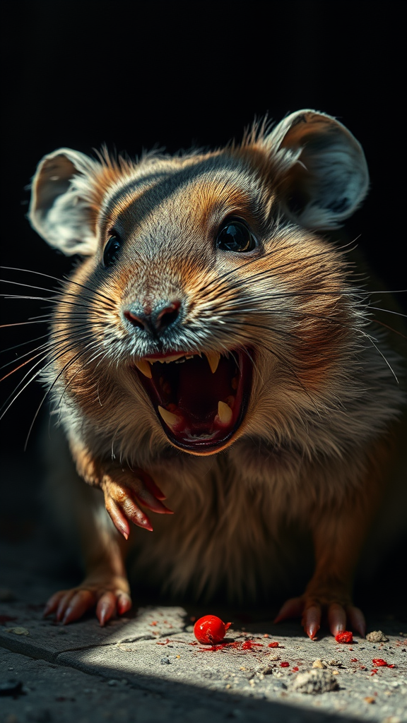 A chillingly realistic depiction of an aged hamster takes center stage, its once-soft fur now matted and worn with age. Natural light casts eerie shadows across its form, accentuating every intricate detail of its leathery skin. The unsettling setting heightens the sense of dread, with the hamster's mouth agape, revealing an unnaturally large array of sharp teeth, glistening ominously with fresh blood. Its eyes are like voids, deep black and devoid of life, evoking a shiver down the spine. A distinct scar runs across its right cheek, a testament to battles long past. The surrounding darkness cloaks everything in a sinister embrace, leaving the viewer both fascinated and horrified by the scene.