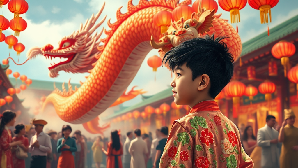 A Chinese boy stands in awe before a majestic lunar new year dragon, captured in a digital painting style. The scene is vibrant, with intricate costumes that blend traditional Chinese elements with Victorian-inspired illustrations. The boy’s embroidered attire harmonizes with the joyous chaos of the festivities, featuring splashes of light red and green. The dragon, both mythical and meticulous in its detail, weaves through the background, its scales shimmering under lantern-lit skies. The atmosphere is lively and full of cultural authenticity, as excitement dances in the air amidst the bustling celebration.